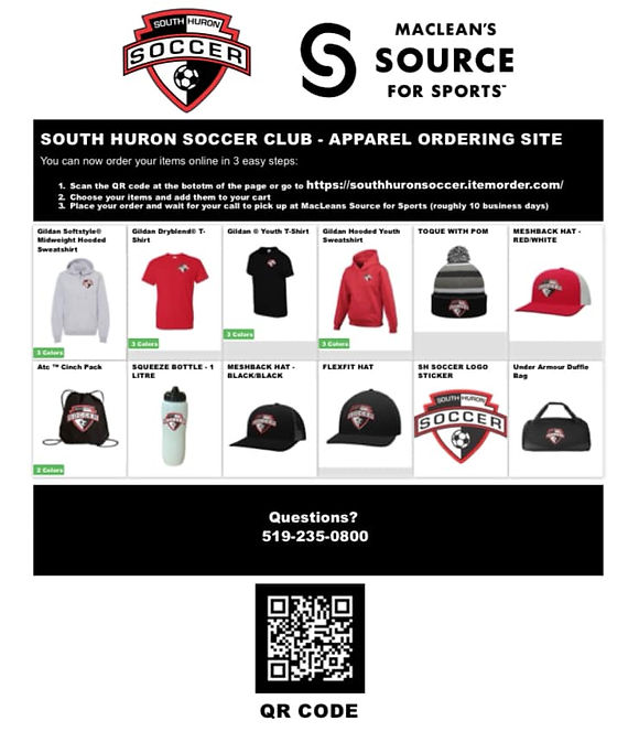 The South Huron Soccer Club is proud to partner with Exeter's own MacLean's Source for Sports to provide apparel options to show your SH Soccer pride! Click on the link below to place your order, or follow the easy steps in the photo!